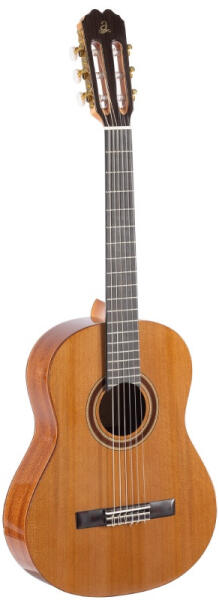 Admira Granada – Klasszikus gitár tömör cédrus fedlappal Az Admira Granada a kezdő és középhaladó gitárosok számára kínál kiváló minőségű, inspiráló hangszert. A tömör cédrus fedlap gazdag, kifejező hangzást biztosít, míg a dió hát- és oldallapok fényes tónust és kiegyensúlyozott középtartományt adnak – hangzásvilága a rózsafa és a mahagóni között helyezkedik el. A gitár fényes lakkozású felülete kiemeli a természetes faerezet szépségét, a mahagóni nyak és a kabukalli fogólap pedig kényelmes játékérzetet biztosít. A líra formájú, nikkel hangolókulcsok pontos hangolást és hosszú távú stabilitást garantálnak. Az Admira kezdő széria hangszerként nemcsak tartós és szépen szól, hanem élvezetesé és könnyűvé teszi a tanulási folyamatot is – egy olyan gitár, amely mellett gyorsan fejlődhet a játékod. Főbb jellemzők: