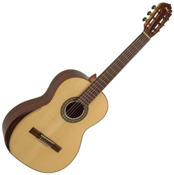 4/4-es méretű klasszikus gitár, tömör fenyő fedlap, rózsafa dekor oldal és hát